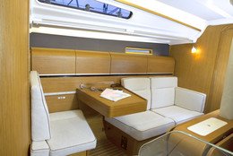 Die Dehler 38 bietet Platz für 7 Personen. Das Schiff ist ausgestattet mit 3 Doppelkabinen. In der Salon kann der 7. Person schlafen. Das Innenleben der Dehler 38 ist durchdacht und perfektioniert bis in das letzte Detail. Die Salonschränke lassen sich zum Beispiel nach oben öffnen. Die Kombüse hat ein Kühlschrank, 2 Flammenkocher und Backofen und warmes Wasser. Der geräumige Toilette und Dusche befindet sich neben der Kajüten Eingang.