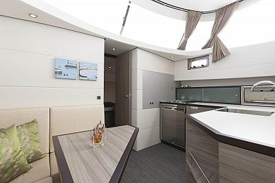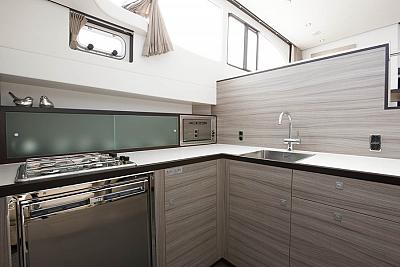 Der gemütliche Salon mit Lounge / Sitzecke ist komplett mit Flachbild-TV und Radio ausgestattet. Über ein paar Stufen erreicht man die sehr gut ausgestattete Küche (mit Backofen) und gegenüberliegender Dinette.
