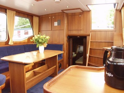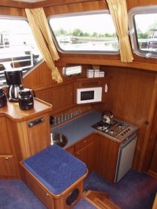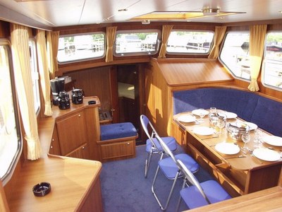 Stilvolle, geräumige Innenausstattung. Vorschiff: 2 separate Kabinen mit jeweils 2 Einzelbetten. Geräumige Pantry mit 4-fl. Gasherd, Kaffeemaschine, Mikrowelle und geräumigem Kühlschrank. Waschraum mit Toilette und Dusche. Salon mit Eck-Polsterbank, Farbfernseher und DVD-Spieler.Steuerstand und Seiteneingängen, Tisch, Anrichten und Schränken, DVD/CD-Spieler, Farbfernseher, selbstausrichtende Satelliten-Antenne. Achterschiff: 1 geräumige Kajüte mit 2 zusammenschiebbaren Betten nebeneinander, 1 Kajüte mit einem etagenbett, Waschraum mit WC und Dusche, separate Toilette. Sonnendeck, Schwimmplateau, beheizbarer Steuerstand, Tiefenmesser, GPS, Ruderstandsanzeige und Cabrio-Abdeckung. Im gesamten Schiff stehen jederzeit 220 Volt zur Verfügung, u.a. für den Mikrowellenherd, die Kaffemachine, und den Farbfernhseher.