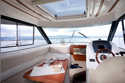 Die neue Beneteau Antares 7.80 verfügt über ein großzügiges Steuerhaus mit großen Fenstern, die eine tolle Aussicht bieten. Überdacht steuern, ohne sich eingeschlossen zu fühlen! Die große Dachluke und die riesige Schiebewand sorgen für einen schönen Lichteinfall.