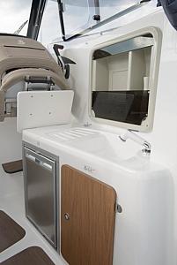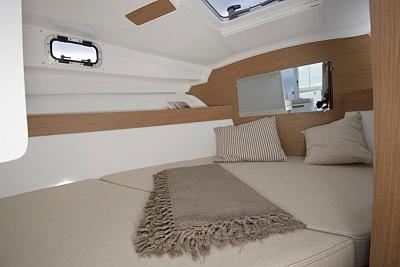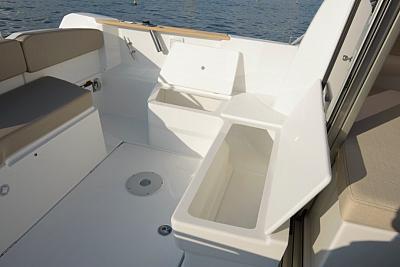Das Cockpit der Antares kann beliebig eingeteilt werden. So können Sie sich für Sitzmöglichkeiten mit Tisch entscheiden, oder Sie bauen die Sitzecke einfach zu einem großen Sonnenbett um! Hätten Sie gern ein offenes Cockpit zum Angeln oder Schwimmen? Auch das ist schnell und einfach zu realisieren. Der Durchgang zum Vordeck ist sicher, da eine Seereling vorhanden ist.