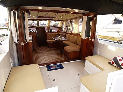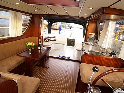 Durch ihre Breite von gut 3.90 m ist die Olympia 34 Kreuzer nicht nur sehr geräumig, sondern auch besonders stabil. Dank der niedrigen Bauweise diesen modernes Schiff