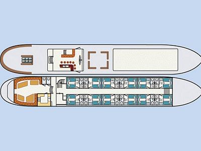 Dieses prächtige Fünfsterneschiff bietet in jeder Hinsicht viel Luxus und Behaglichkeit. Das Steuerhaus und das hölzerne Deck sind die absoluten Prunkstücke des Schiffes. Alle geräumigen Kabinen haben zwei einzelne Boxspringbetten, die auf Wunsch als Doppelbett zusammengeschoben werden können. Ein drittes Boxspringbett befindet sich in jeder Kabine fest gegen die Wand geklappt, sollte die Kapazität erweitert werden müssen, bzw. eine andere Aufteilung der Kabinen gewünscht sein. Eine eigene Dusche mit Toilette und Waschbecken sorgen für extra Komfort während Ihres Aufenthalts an Bord.