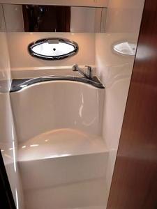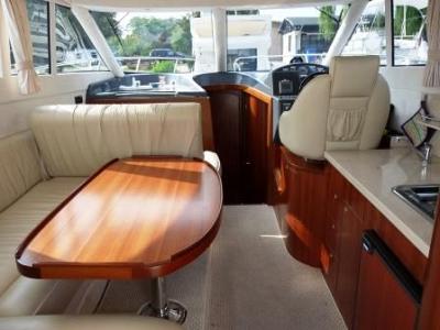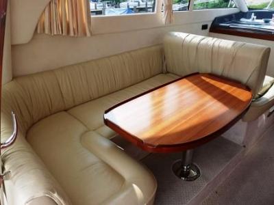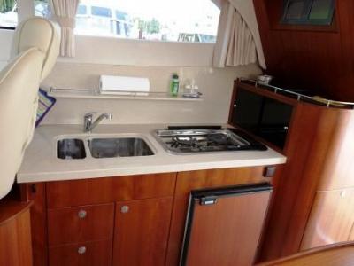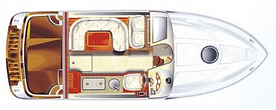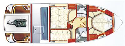 elegante Bugkabine mit französischem Doppelbett; Flurtrakt mit Eingängen zum seperatem Duschraum, WC-Raum sowie zu den Unterflurkabinen und der Bugkabine; 1x Unterflurkabine mit Einzelkoje; 1x Unterflurkabine mit Doppelkoje; Salon mit Innensteuerstand, kompletter Pantry und multifunktionaler Sitzgruppe; großzügiges Cockpit mit Treppe zur Fly; Badeplattform mit ausziehbarer Leiter; Fly mit Außensteuerstand und Sitz-Liegegruppe; Regen- und Sonnenschutzpersenninge;
