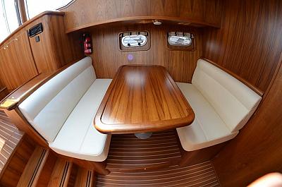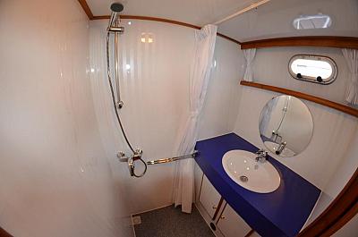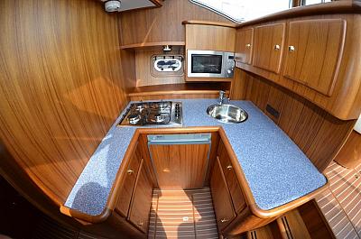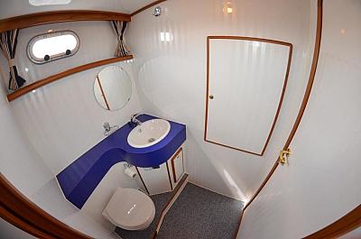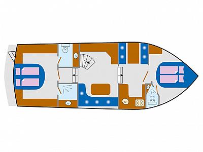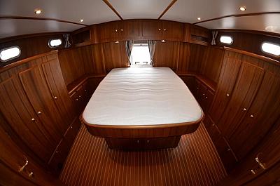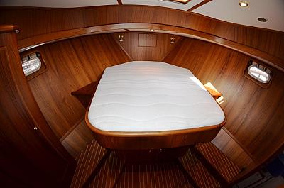In der Bugkabine befindet Sie ein großes freistehendes französisches Doppelbett und Schränke für zwei Personen sowie der Zugang zu der vorderen Nasszelle mit Waschtisch und elektrischer Toilette. Desweiteren befindet sich im Vorschiff eine U-förmige Pantry mit Kühlschrank, Spüle, 4-flammigem Herd, Mikrowelle und vielen Staumöglichkeiten (Schränken und Schubladen). Im Salon erstreckt sich eine lange Schrankzeile mit TV-Schrank auf der Backbord-Seite sowie eine L-förmige Sitzgruppe auf der Steuerbord-Seite der Yacht. Im Heck unserer "MS Fantasia" befindet sich ein zweites freistehendes französisches Doppelbett mit vielen Schränken und Ablagen in der Achterkabine sowie einem Zugang zu der achterlichen Nasszelle mit Waschbecken und einer elektrischen Toilette auf backbord sowie einer völlig separaten Nasszelle auf steuerbord mit Dusche und Waschtisch. Achterdeck mit Rundumpersenning und zwei festen Treppen zur Badeplatform.