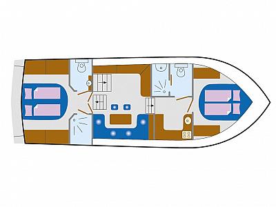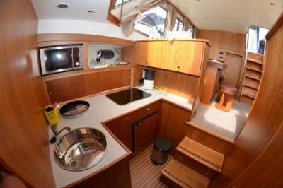 Bugkabine mit französischem Bett und Schränken, Vorschiff mit einer Nasszelle auf backbord mit Waschtisch und WC inklusive einer abgetrennten Dusche, komplette Pantry mit Spüle, Gasherd, Kühlschrank und Mikrowelle auf steuerbord im Vorschiff, Salon mit Schränken und U-Sitzgruppe (umbaubar zu einer Liegefläche) und 2. Kühlschrank, Achterkabine mit extra langem französischen Bett (2m) und Schränken, separate Dusche und Toilette in der Achterkabine, Achterdeck mit komfortablen Steuerstand, Sprayhood, Sonnensegel und Badeplattform