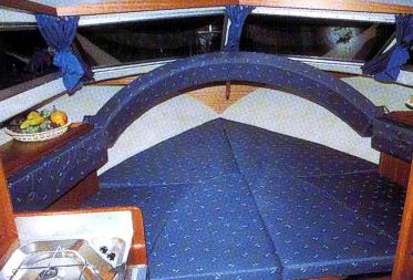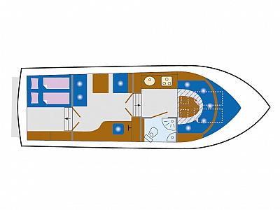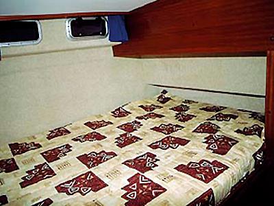 Vorschiff mit Rundsitzgruppe umbaubar zu einem großen Doppelbett; Sanitärraum mit WC, Waschbecken und Dusche; Pantry-Küche mit großem 12 Volt-Kompressor Kühlschrank, Spüle und 2flammiger Gasherd; Cockpit mit Sitzgruppe, Tisch und Sonnenliege sowie dem gut überschaubaren Steuerstand; gemütliche Achterkajüte mit großem Doppelbett und Schränken;