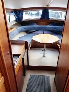 Die geschickte Konstruktion der 9-Meter-Yacht bietet ein überdurchschnittliches Raumangebot: Eine große Sitzgruppe im Vorschiff sorgt für Gemütlichkeit unter Deck. Sie ist umbaubar zu einem Doppelbett, bequem für zwei Personen. Eine geräumige Eignerkabine achtern mit einem großen Doppelbett bietet ausreichend Platz für zwei weitere Personen. Der Steuerstand sowie eine schöne kleine Sitzgruppe befinden sich mitschiffs an Deck. Hier ist auch viel Platz zum Sonnen. Zum Baden benutzen Sie die Badeleiter auf der Badeplattform. Die Yacht ist ideal für einen Urlaub für bis zu vier Personen.