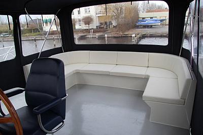 Auf dem Hinterdeck ist ein komfortable Sitzbankkombination mei einer Überdachung/Persenning vorhanden.