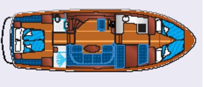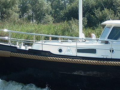 Robustes Äußeres, hervorragende Fahreigenschaften und ein großzügiges Interieur für 6 Personen. Die Ausführung ist luxuriös mit Teakholz, Doppelfenster, durchgehend 220V an Bord, Mikrowelle, Fernseher mit Deutsch-Kanäle, Kaffeemaschine, elektrische Toilette, GPS, Teakdeck und Tauwieling außenrund. Besonder ist wohl die Durchfahrtshöhe. Diese geht minimal auf 2.50 m., also auch kleinere Fahrwasser sind möglich. Schiff hat kein Innensteuerstand, wie im Grundriss.