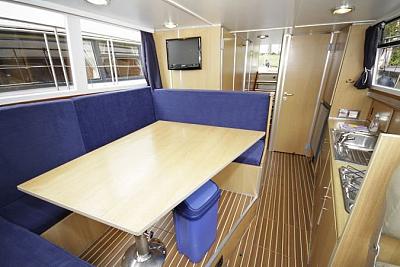 Sie suchen ein Hausboot mit ausreichend Platz für eine Familie oder zwei Paare? Mit 3 Doppelbetten und seinem extra Aufgang vom Salon zum Oberdeck ist das Hausboot Silent 116 bestens dafür geeignet. Geniessen Sie im panoramaverglasten Salon auch bei schlechten Wetter die Aussicht auf die Sehenswürdigkeiten in Berlin und Naturschönheiten in Brandenburg. Auf dem großen Oberdeck ist Platz für die gesamte Crew. Ein Sonnensegel schützt vor zu viel Sonne. Dusche und WC befinden sich selbstverständlich ebenfalls an Bord.