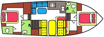 Einteilung:Geräumige Vorderkajüte mit Doppelbett und 2.Kajüte mit Doppelbett uber Steuerbord.2.Badezimmer mit Toilette, Dusche und Waschbecken.Grosszügiger Salon mit Sitzecke und Küche mit Kühlschrank, Kaffeemaschine und Microwelle. Dinette, welche auch als Doppelbett dienen kann.