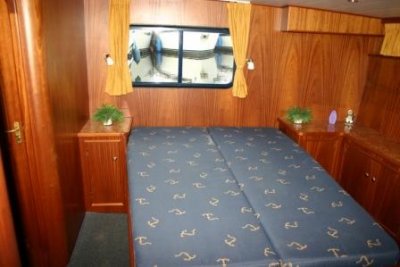 Geräumige Hinterkajüte mit Doppelbett und Frisiertisch.Elektrische Toilette und separate Dusche mit Waschbecken.