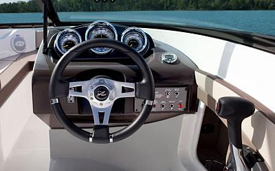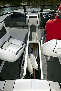 Damit bei diesem Boot der Spurt stimmt, sprich der Übergang von Verdränger- in Gleitfahrt zügig ablaufen muss haben wir dieses Boot mit dem Mercruiser 4.3 V6 mit 220 PS Ausgestattet. Mit nur kurzem Anheben des Bugs kommt die Sea Ray zwischen 1500/min und 2300/min ruck, zuck ins Gleiten, was zusammen mit der mäßig flachen Heckwelle eine gute Voraussetzung zum Wasserskilaufen und Tubefahren ist.