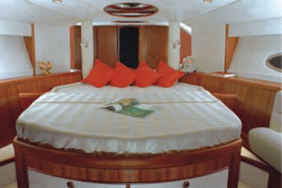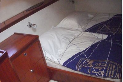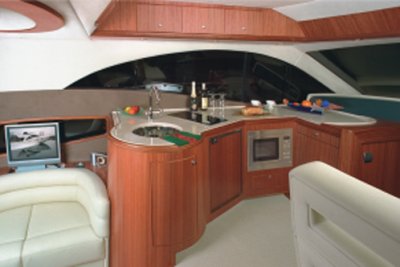 The teak wood stern area leads you through sliding doors into a very light lower part of the salon, where two sofa units are placed and a collapsible table. The upper part of the salon is part stern area and a kitchen with plenty of work area.