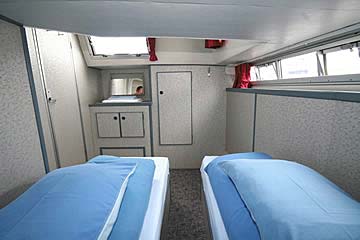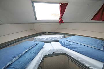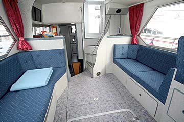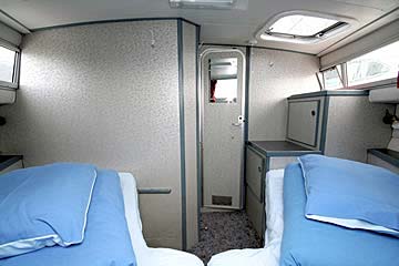 Geeignet für 4 bis 6 Personen, ideal für drei Paare oder eine Familie. Heckkabine mit 1 Doppel- oder 2 Einzelbetten, Bugkabine mit 1 Doppel- oder 2 Einzelbetten, Seitenkabine mit Doppelbett, Salon, 2 WC mit Waschbecken und Dusche, große Küche, Radio/CD-Player mit Anschluss für MP3-Player, 12-V-Anschlüsse, 350W-Inverter für 220V (nicht für Haartrockner geeignet!), Warmwasserversorgung, Zentralheizung, 2. Steuerstand aussen ("Flybridge"), Sonnendeck, Beiboot. Moderne Einrichtung und umfangreiche Ausstattung.
