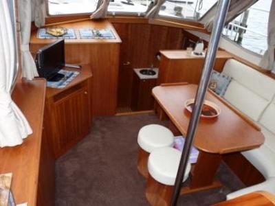 Bugkabine mit französischem Bett und Schränken, Vorschiff mit einer Nasszelle auf backbord mit Waschtisch und WC inklusive einer abgetrennten Dusche, komplette Pantry in L-Form auf steuerbord im Vorschiff, Salon mit Schränken und L-Sitzgruppe (umbaubar zu einer Liegefläche), Achterkabine mit französischem Bett und Schränken, getrennt Dusche/Toilette in der Achterkabine, Achterdeck mit komfortablem Steuerstand, Spayhood, Sonnensegel und Badeplattform