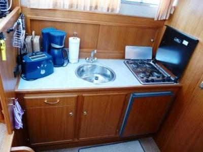 komplette Pantry mit Spüle, Gasherd und Kühlschrank auf backbord ;