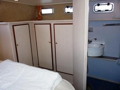 Achterkabine mit freistehendem französischem Doppelbett und Schränken sowie die Nasszelle mit Waschtisch, Dusche und WC