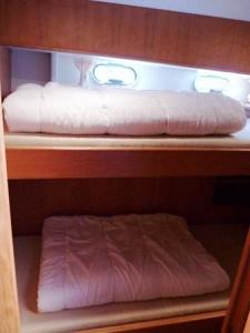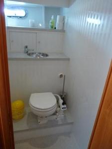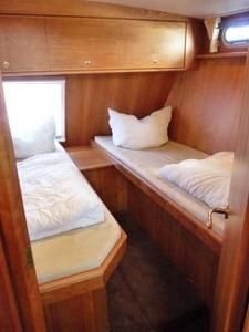 Im Heck der Yacht befinden sich zwei gleich große Achterkabinen mit jeweils zwei Einzelkojen und jeweils Dusche/Toilette. Salon mit Sitzgruppe und Tisch auf steuerbord und die komplettausgestattete Pantry auf backbord. Im Vorschiff befindet sich auf der Steuerbordseite eine Seitenkabine mit Etagenbett und auf der Backbordseite 1x Dusche sowie 1x Toilette. Bugkabine mit V-Koje und einem Etagenbett sowie Schränken. 2x Wendeltreppe zur Badeplattform.