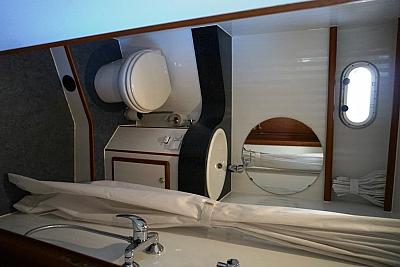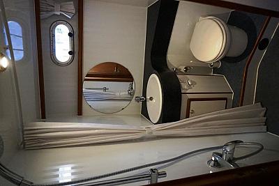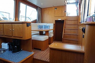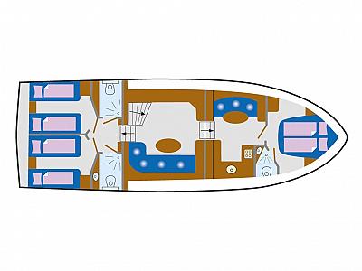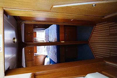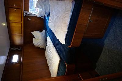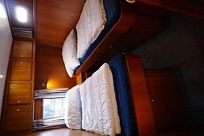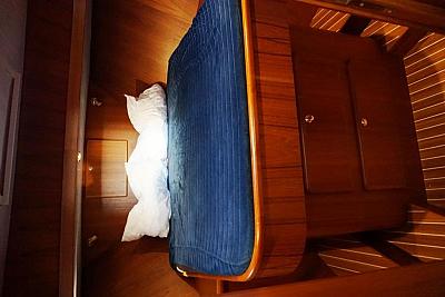 In der Bugkabine befindet Sie ein großes freistehendes französisches Doppelbett und Schränke für zwei Personen sowie der Zugang zu der vorderen Nasszelle mit Waschtisch, elektrischer Toilette und Dusche. Desweiteren befindet sich im Vorschiff eine U-förmige Pantry mit Kühlschrank, Spüle, 4-flammigem Herd, Mikrowelle und vielen Staumöglichkeiten (Schränken und Schubladen). Gegenüber befindet sich eine gemütliche Sitzgruppe. Im Salon erstreckt sich ein lange Schrank Zeile mit TV-Schrank auf der backbord-Seite sowie eine L-förmige Sitzgruppe (umbaubar zu einem weiteren Schlafplatz) auf der steuerbord-Seite der Yacht. Im Heck unserer "Sanchia" befinden sich zwei identische Achterkabinen mit jeweils zwei Einzelbetten. Die Zugänge zu den zwei getrennten Nasszellen mit Waschbecken, elektrischer Toilette und Dusche sind vom Flur aus erreichbar.