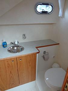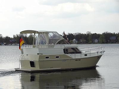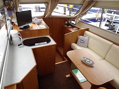 VORSCHIFF: Bugkabine mit V-Koje und Schränken; Nasszelle mit Toilette, Waschbecken, Dusche; Schrank auf Stb-Seite; SALON: Sitzgruppe mit Tisch Pantry mit Kühlschrank, Herd und Spüle auf der BB-Seite, Schrankzeile und TV-Schrank, ACHTERN: Heckkabine mit zwei breiten Kojen und Schrank