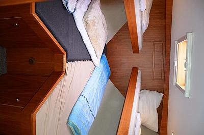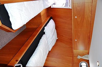 Im Heck der Yacht befinden sich zwei gleich große Achterkabinen mit jeweils zwei Einzelkojen und jeweils Dusche/Toilette. Salon mit Sitzgruppe und Tisch auf steuerbord und die komplettausgestattete Pantry auf backbord. Im Vorschiff befindet sich auf der Steuerbordseite eine Seitenkabine mit Etagenbett und auf der Backbordseite zwei Nasszellen mit Dusche/Toilette. Bugkabine mit V-Koje und einem Etagenbett sowie Schränken.