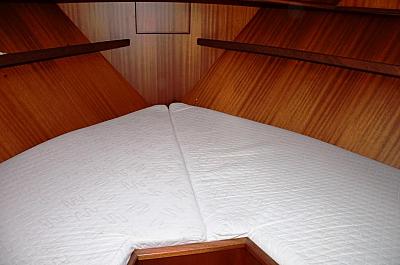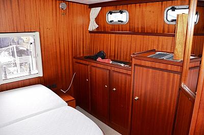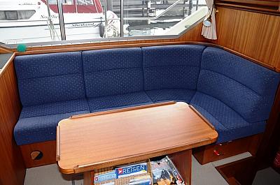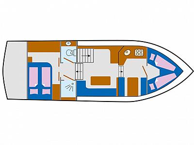 Achterkabine mit querstehendem Doppelbett und Schränken, Flur zur Achterkabine und den Nasszellen, Duschraum auf stb, Toilettenraum auf bb, Salon mit L-Sitzgruppe auf stb, Schrankzeile auf bb, Dinette (umbaubar zur Liegefläche) auf stb und Pantry bb, Bugkabine mit V-Koje, verlängerte Badeplattform
