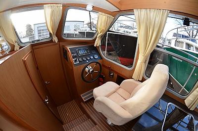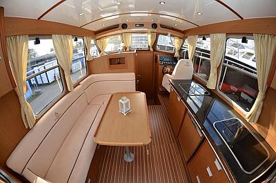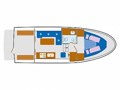 Bugkabine mit V-Koje und Schränken. Nasszelle mit Toilette, Waschbecken und Dusche. Steuerstand mit bequemen Steuerstuhl. Salon mit L-Sitzgruppe (umbaubar zur U-Sitzgruppe und Doppelbett) und Tisch (der Tisch ist umsteckbar zur Verwendung aussen im Cockpit). Pantryzeile mit Kühlschrank, Spüle, Herd und vielen Schränken. Cockpit mit zwei Sitzgruppen und viel Stauraum. Badeplattform mit Badeleiter. Großzügiges Vorschiff mit breiten Gangborden.