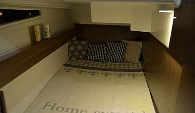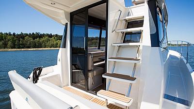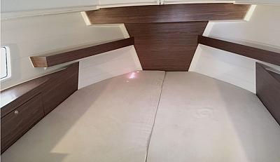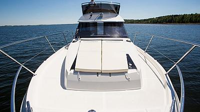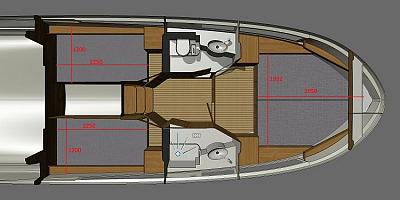 3 Kabinenversion mit zweimal Dusche/Toilette. Bugkabine mit Doppelbett und Schränken. Zwei vom Flur aus begehbare Nasszellen mit 1x Dusche und Waschbecken und 1x Toilette und Waschbecken. Zwei vom Flur aus begehbare Unterflurkabinen mit Doppelbett und Schrank. Salon mit Innensteuerstand, Küchenzeile und gegenüberliegender Sitzgruppe mit Tisch. Cockpit mit ausklappbarer Sitzbank (auch als Sonnenliege nutzbar). Treppe nach oben zur Flybridge. Flybridge mit Außensteuerstand und einladender Sitzgruppe. Platz bietendes Vordeck mit großen Liegeflächen sowie großzügige Badeplattform mit bequemen Durchgang zum Cockpit.