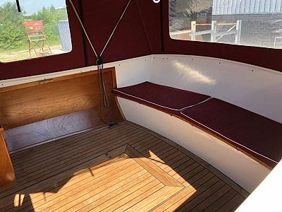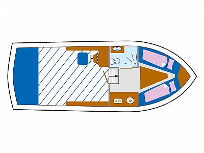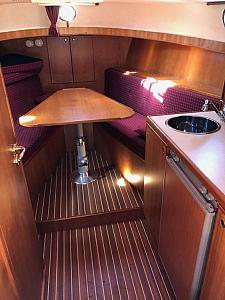 Vorschiffskajüte mit Tisch und V-Sitzgruppe (umbaubar zum Doppelbett). Pantry auf steuerbord mit Gas-Kocher, Kühlschrank und Spüle. Toilettenraum mit Handwaschbecken auf backbord. Großzügiges Cockpit mit Steuerstand und Sitzgruppe überdacht mit einer Persenning.