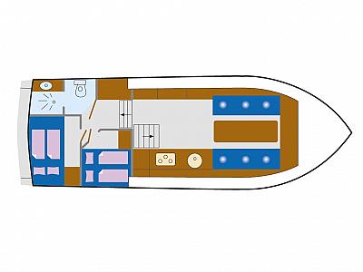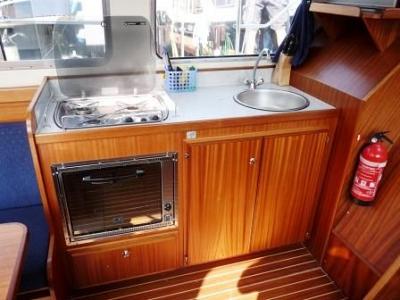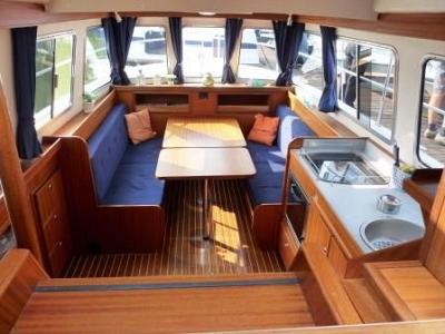 Salon: Im Salon bietet die großzügig gestaltete Sitzgruppe (umbaubar zu einem großen Doppelbett) viel Wohnkomfort. Die große Pantry und die vielen Schränke und Ablagen sowie Spüle, Gasherd, Kühlschrank und Backofen runden dieses gelungende Raumkonzept ab und verleihen dieser Yacht ihren besonderen Charme. Achterschiff: Im Heck der Yacht sind zwei etwa gleich große mit jeweils einem Doppelbett und Kleiderschrank ausgestattete Achterkabinen angeordnet. Desweiteren erreicht man über den gut begehbaren Flurtrakt die geräumige Nasszelle mit abgetrennter Dusche, elektrischen WC und Waschbecken. Deck: Auf dem großzügigem Deck mit Steuerstand, Sprayhood und Sonnensegel sowie den breit ausgelegten Gangborden ist jederzeit ein sicheres Fortbewegen möglich und mit einer Badeplattform mit Klappleiter ein sicheres Gefühl Ihr stetiger Begleiter.