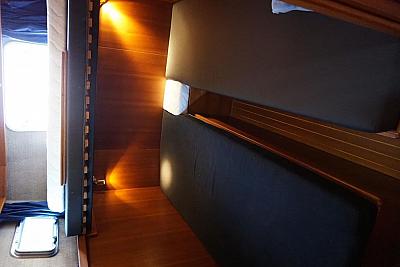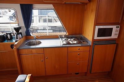 Salon: Salon mit schöner Aussicht, komplett mit Pantry, grosser Sitzgruppe (umbaubar zu einer Doppelkoje), Schränken und vielen Stauräumen. Vorschiff: Bugkabine mit großer V-Koje und Schränken. Bugtoilettenraum mit elektrischer Toilette, Waschbecken und Duschfunktion. Heck: Zwei identische Achterkabinen mit Einzelbetten (umbaubar zum Doppelbett) und Schränken. Zwei großzügige identische Nasszellen mit Toilette, Dusche und Waschbecken, die von der Achterkabine oder von der Vorhalle aus begehbar sind. Zusätzlich gibt es in den Achterkabinen jeweils ein Etagenbett mit einer Liegelänge von ca.2m.